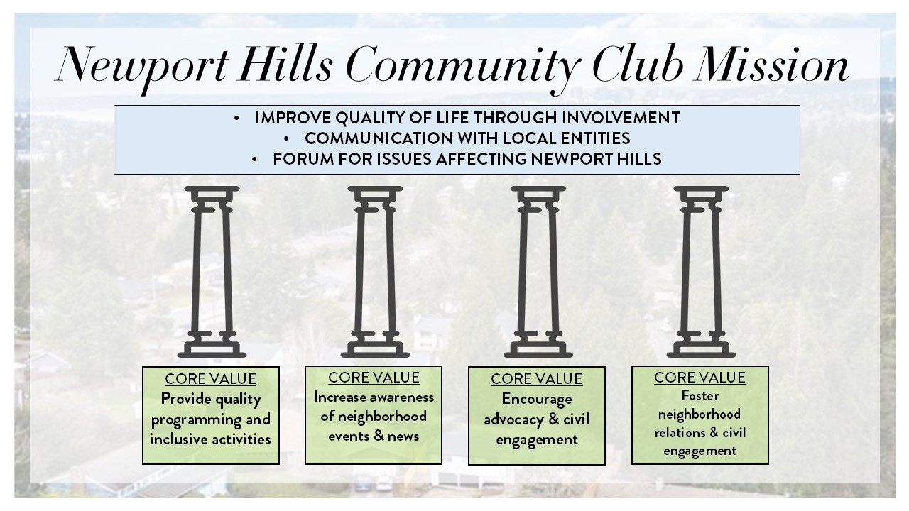 The Newport Hills Community Club, formed in 1969, is a volunteer neighborhood organization that serves its membership by publishing news and information, acting as a forum for issues that pertain to our area, supporting and taking positive action towards community improvements and promoting regular social events throughout the year for all residents.